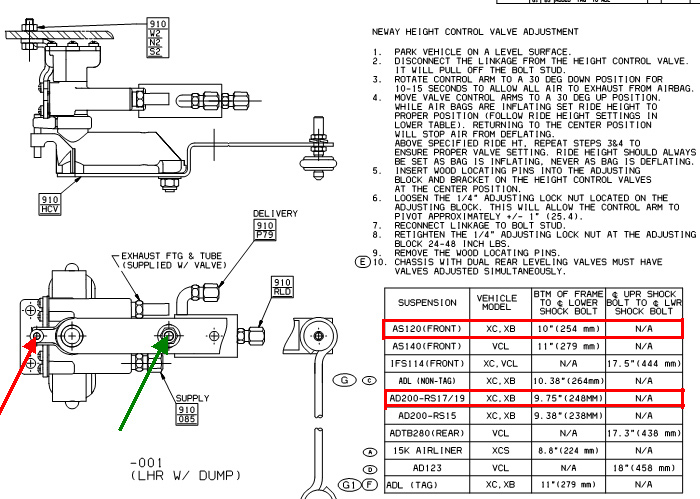 Freightliner Ride Height Control Valve AdjustingI have recently been asked to explain the procedure for adjusting the ride height on a Freightliner chassis. I will use my chassis as an example it is a 2007 XC chassis with a 40 foot Phaeton coach. My chassis has three height control valves, one on the front driver's side of the axle and two on the rear axle one on each side. The front height control valve is used to adjust the ride height on the front axle both left and right sides. The two control valves on the rear axle are adjusted simultaneously. Adjusted one side of the rear axle will affect the height of the opposite side of the rear axle. So it takes a little tweaking back and forth to get good results.
