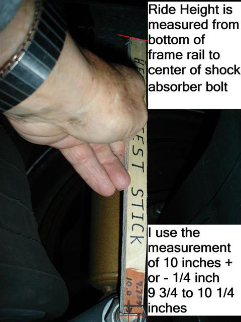 The distance between the two red lines by design is 10 inches on my XC-R chassis. I have taken a small piece of plywood and made me a ride height test stick. Its simple to make I made it 10 inches long and marked 9 3/4 inches on it. I place one end of the stick against the bottom of the frame rail and adjust the height control valve until the opposite end of the stick is centered on the shock absorber bolt.