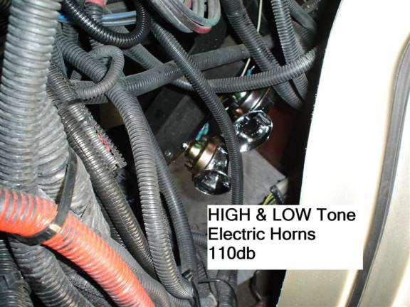 Replacing Freightliner's Electric HornAfter over two years of hearing the wimpy electric horn installed by Freightliner I decided to replace the horn. I picked up a pair of cheap High & Low tone horns from Harbor Freight. Freightliner supplies its horn's power through a fuse and relay which are mounted under the drawer stack on my 2007 Phaeton. The horn supply circuit is Freightliner # 24B and ASE circuit # 2107. The ground for the horn is Freightliner general ground 1 and SAE circuit # 1204. As I was not sure if Freightliner provided enough power to drive the two new horns I decided to use the Freightliner horn wiring to close the relay supplied with the new horns. I installed a new 20 Amp thermal breaker and used it to power the relays contacts. I cut the Freightliner wiring near the OEM horn and then used those two wires to close the new relay's contacts. Below is a picture of the new horns. The new horns are mounted about a foot lower then the OEM horn on the driver's side.
