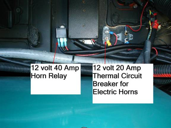 I was looking to separate the air horns from the electric horns as they are currently wired to provide only electric horns or both air horns and electric horns when the drivers side console horn switch is turned on. Alas, Tiffin only supplied a switch with one set of contacts (a normally open contact and a common contact) and my stash of matching switches did not provide me with an option. So my coach is still wired for electric horns or both air horns and electric horns together. Below is a picture of the new horn relay and the 20 amp thermal breaker for the new horns.