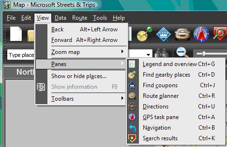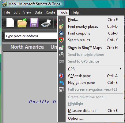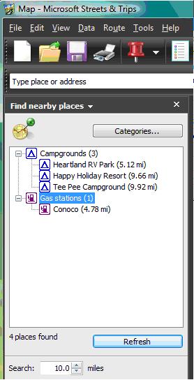 Streets and Trips TutorialWe use Microsoft Street & Trips a lot for both trip planning and GPS as we travel. We like the fact that we have a large computer screen to work on, rather than the little hard to see screens of many GPS units. We find S&T has many useful features. Finding places along our route or near the places we visit is one of the best features. I will try to explain how some of the Points of Interest features work. The first method of finding places with S&T is using the Address Line. This could also be called the FIND line or the SEARCH line. It is a long rectangular box near the top of the screen with a down arrow and a binocular icon next to it. On this line you can enter a specific street address including town and state or Zip Code or you can just enter the name of a town with a state or you can just enter a Zip Code and S&T will take you to that location when you click the binocular icon or hit ENTER.