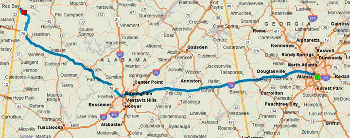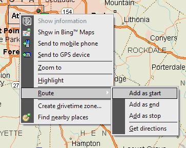 Take some time to Click around the different Tools to get familiar with what different tabs and icons might do. The next neat trick with S&T is Route Planning. This is where I find Right Clicking to be very useful. We can zoom in on a specific location on our map. We can use Find to locate places. But for simplification I will just pick Atlanta to Red Bay, AL. I Right Click on the word Atlanta and a Pane opens with options. I Click ROUTE and another Pane opens with more options. I Click ADD AS START and the Panes close. A green box with the number 1 appears by the word Atlanta.
