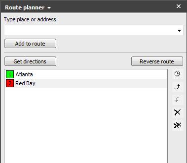 I now move my cursor to Red Bay, AL (you can use the address line to find Red Bay or any other place) on my map and again I RIGHT CLICK on the word Red Bay and then ROUTE and then ADD AS END. Now there is a red number 1 by Red Bay. Up on the Tool Bar is the little car icon which is for Route Planner. Click the car and a left side column pane opens. This is the Route Planner. Click GET DIRECTIONS and the Route Planner will calculate the route and the route will appear on the map as a blue line.