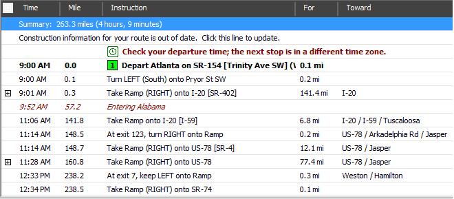On your computer screen you should now show the map with a blue line marking the chosen route as well as the Route Planner Pane to the left. Above the map you should see the Directions Pane where you will see detailed written directions showing total miles for this route as well as the roads to take and where the turns might be etc. This is the Directions Pane which you can turn On/Off by Clicking the little Steering Wheel icon up on the Toolbar. You can also Open/Close the Route Planner Pane on the left by Clicking the little Car icon. Below is just part of the written Directions for this route.