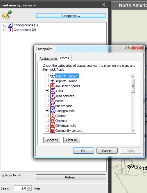Next we Click on Categories to open another window pane. We can choose Restaurants which is a long list of types or restaurants (Chinese, Italian, Etc.) or we can Click to open the Places tab where we can selected the type of places we want to search for. For example we can search for things like ATMs, Campgrounds, Gas Stations, etc. We can search from a specific point on the map. Here again we can use Right Click. Once you have selected Distance (I now changed this to 2 miles) and Categories of interest go back to the map and pick a spot. Right Click and just as before a new Pane will open with options. Click Find Nearby Places.