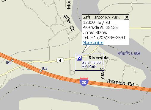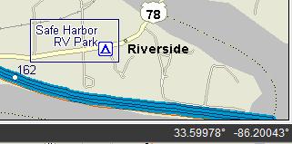 I Right Clicked near Riverside, AL and my Find Nearby Places said there was one campground within 2 miles of that location. I DOUBLE CLICK on the name of the location on my Find Nearby Places Pane and another little pane opens on my map giving me some details about that place. Note the crosshatch circle on the map – this is the 2 mile search area.