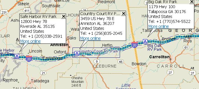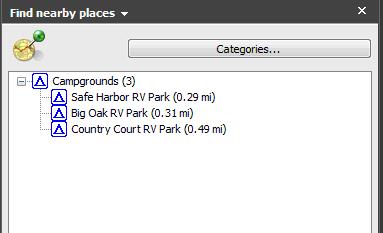 Our Find Nearby Places list now shows us it has found 3 campgrounds along our route. Click on a Campground name and an info pane will open on the map for each location.