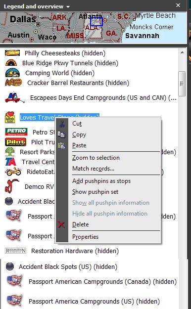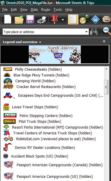 THE MEGA FILE Though there are a great many POIs already in S&T there are many places where we can find more POIs to download to be used in S&T. The 2010 version of S&T made one huge advancement over previous versions. Discovery Owners Group is a bunch of motorhome owners. This group was originally all Discovery motorhome owners but now it seems there are other interested people involved. For many years these people have been working on POI files of interest to RVers. Prior to 2010 each file had to be downloaded individually and once the file was included in S&T the icons were on the map. People have been asking Microsoft for a better way. So the Discovery people and Microsoft people along with some other people such as Laptop GPS World forum users somehow got together and figure it out. They have created something called the MEGA FILE which can be found on the Discovery website and Laptop GPS World website. Here are some links about the MEGA FILE. Be aware that this only works as described with S&T 2010. POIs can be added to previous versions of S&T but they can not be turned on/off. IMPORTANT NOTE: THE MEGA FILE AND ALL POI SOURCES I USE ARE TOTALLY FREE Here is a You Tube video (very strange) that shows how the Mega File works. DISCOVERY OWNERS POIs - Learn about the Discovery files and the group. http://www.discoveryowners.com/cginfolinks.htm http://www.discoveryowners.com/cginfo.htm The Mega File can be found and downloaded on the Discovery website but I chose to use the version from Laptop GPS World. MEGA FILE POI FROM LAPTOP GPS WORLD This is where I went to download the Mega File in the long form so I did not have to un-zip it – it doesn’t take long – a few minutes - and if you have S&T 2010 (does not work with previous versions) the Mega File installs itself with a click. MEGA FILE TUTORIAL and then some………. If you have S&T 2010 in your computer all you have to do is go to either the Discovery website or the Laptop GPS World website in the above link and click to download. The rest is pretty much automatic. You will be asked where you want to save the file. I like folders and neat file keeping so I have a Streets and Trips POI folder which is where I save all these things. Save it as Mega File and you can tell it to put a shortcut on your desktop to make it easy to access. You can use this to open S&T or you can use your original S&T for normal use and only open the Mega File when you need it. In other words all you have to do to start S&T is to click on the Mega File icon or the file where you saved it – I save it as a document but it is really the program with the files – I hope I am not making this more confusing than it is – it is really very simple. Here’s some of how it works. When you start S&T from the Mega File shortcut it will open with the map and with Legend and Overview pane in the left column. If Legend is not open just click the icon to open. Below shows the first few entries in the Mega File for the June 2010 download. This will change on a regular basis - The Mega File is continually updated so it is a good idea to check it online at Discovery every month or so and then download the newest version. You will see what has been changed on the website so if it is not something of interest to you it may not matter if you update. NOTE: that each file name has the word (hidden) after it. That tells us that file is turned off. To turn any file on just Right Click on the file name and a new pane opens.