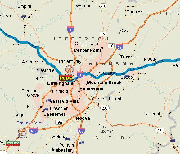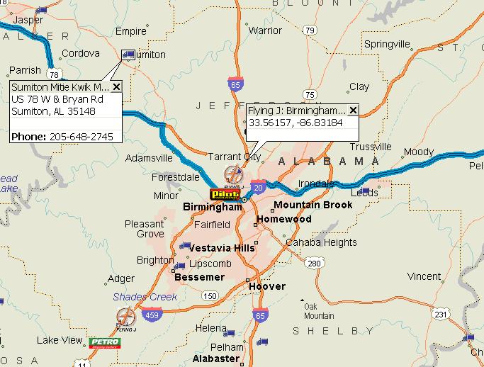 Here is a small part of my map after I turn on Loves, Flying J, Pilot, Petro, and AITA Truckstops (those little blue trucks are AITA truckstops – Properties pane tells us there are 5,256 locations on this list) – AITA is the American Independent Truckers Association – So now we know there are a few fueling possibilities along our route. But we want to know more.