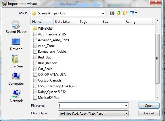 Clicking the Import Data Wizard will open a new pane like the one below. There will be all the S&T POI files saved in the POI Folder in the .csv format. I’ll use Ace since it is first. DOUBLE CLICK Ace. If you created nice folders your POI files will be easy to locate.