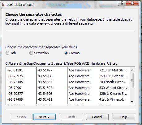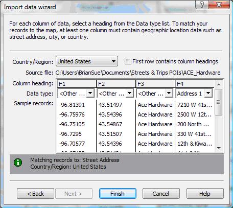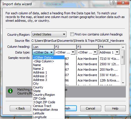 Our Import Data Wizard Pane changes again. This time we have some work to do. Note it has listed Longitude numbers in the first column and then Latitude and then the name of the business and then the address. We need to change the Column Heading and the Data Type line accordingly. Not everyone who creates POI files does it the same way so each file could be a different set-up.