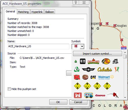 After Clicking finish S&T will take a few moments and then little pushpins will appear all over my map. Below is just the area around Denver as an example (I zoomed). These should all be Ace Hardware stores. How will I know that?