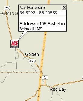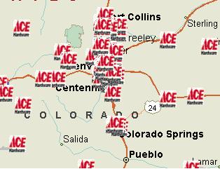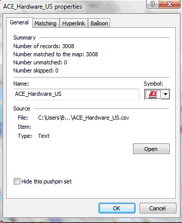 And now instead of red pushpins my map has a whole bunch of little Ace symbols showing the location of lots of Ace stores – actually this file has 3008 Ace hardware locations. As I travel and am in specific locations I can zoom in to find the Ace store nearest to wherever I might be.