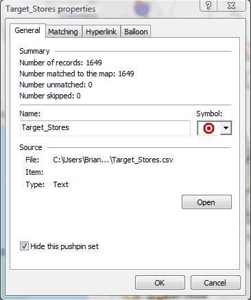 If we download a POI file from one of the POI websites we can check Properties after we import it to S&T. Right Click the file name in the Legend and then Click Properties as I have done with Target Stores below. Note the Symbol. Also note the Number of Records. Sometimes the number for records does not match the Number Matched to the Map. I couldn’t find a sample while writing this but I have seen them. There may be a number by Number Unmatched or by Number Skipped. If this happens you can open .csv files in Notepad by clicking the file in your folder in documents where you saved the file. The .csv files can be edited in Notepad. Some errors can be corrected if you can see them. If the file creator left out a minus (-) you may be able to find it – sometimes at the very bottom of the list – and then add the minus (-) to correct it. There may be other errors you can find and correct. But I do not yet know how to open and correct .gpx files so I only use them if there is no .csv file available. Leaving out a decimal point could be another easy fix – just put one in.