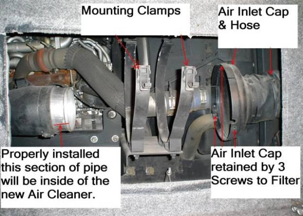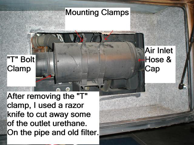 "T" bolt clamp until you can rotate the old air filter and slide it to the right and away from the air outlet tube bead. The
